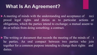 This document discusses void agreements under Indian contract law. It begins by defining an agreement and contract. It then explains that a void agreement is one that is not enforceable by law and does not create any legal obligations from the beginning. Several types of agreements are expressly declared void by the Indian Contract Act, including agreements in restraint of marriage, trade, or legal proceedings, agreements with uncertain meanings, wagering agreements, and agreements contingent on impossible events. Examples of cases related to various void agreements are also provided.