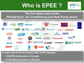 The document discusses the future of hydrofluorocarbons (HFCs) and the F-Gas Regulation. It summarizes the key points made in the document, which are that the F-Gas Regulation has substantially reduced emissions but further reduction is needed. The EU Commission is considering options like banning certain HFCs, a phase-down approach, and improving containment and monitoring to further lower emissions. The industry organization EPEE supports gradually limiting HFC supply through a phase-down approach and fully implementing the current regulation.