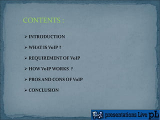 The document presents an overview of Voice over Internet Protocol (VoIP) technology. It discusses how gateways allow calls to transfer between networks, and covers protocols like H.323 and encoding standards like G.723.1 that are used for VoIP calls. Benefits of VoIP include using a single network infrastructure and simple upgrades. Challenges can include latency, jitter and packet loss. The conclusion is that VoIP will continue growing as more voice traffic moves to data networks.