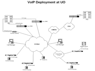 The document discusses VoIP technology developments. It describes several uses for VoIP including voice trunk replacement and end-user appliances. It also outlines common VoIP elements like switching devices, end-user devices, and access gateways. Additionally, it covers VoIP technologies including codecs, delays, call setup standards, quality of service methods, and concerns to be addressed regarding VoIP services.