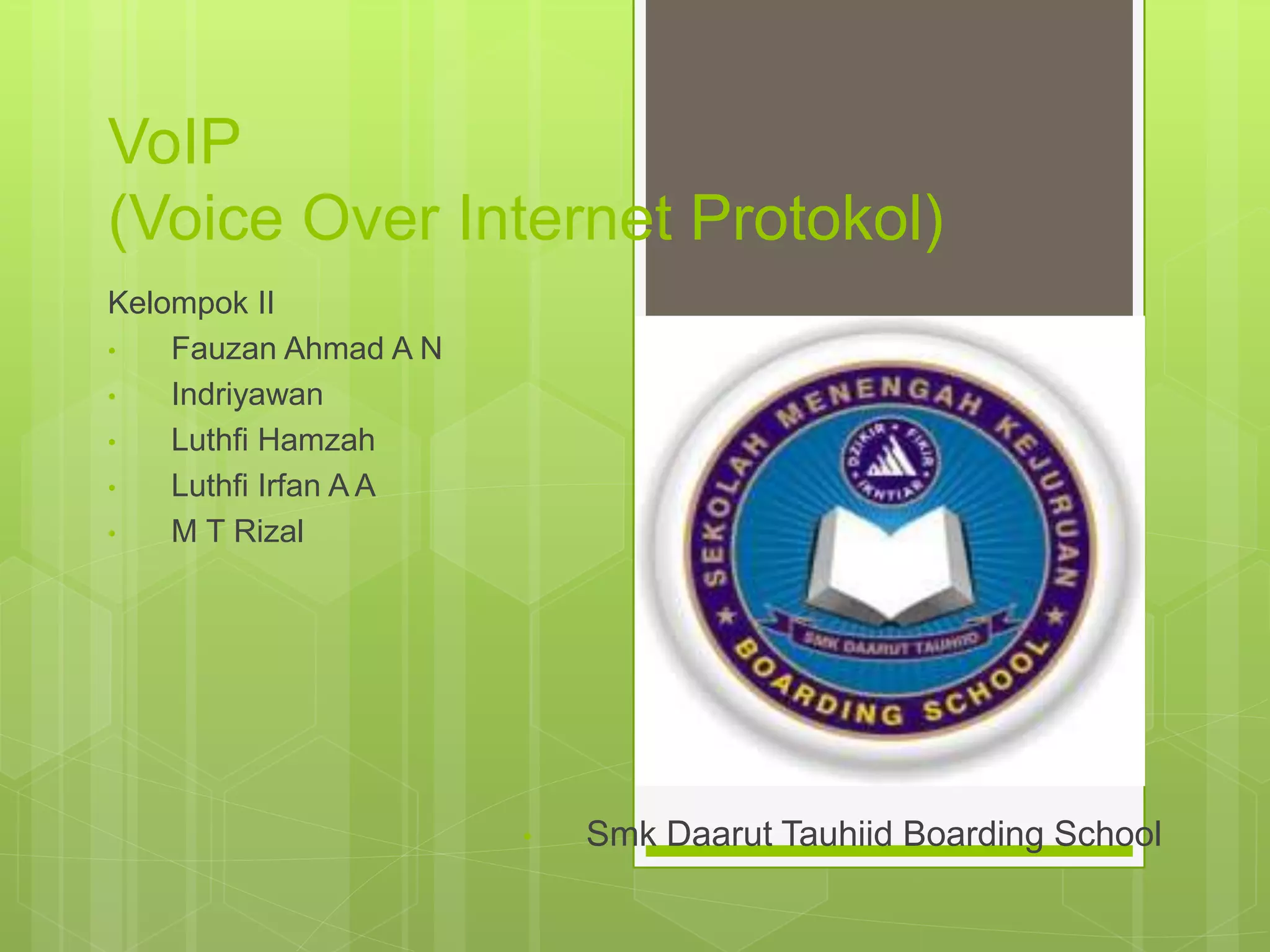 VoIP (Voice over Internet Protocol) adalah teknologi yang memungkinkan komunikasi suara, video, dan data melalui internet dengan mengubah sinyal analog menjadi digital. Dalam VoIP, digunakan berbagai protokol seperti H.323 dan SIP untuk pengaturan sinyal dan transfer data, serta komponen penting seperti VoIP server dan gateway untuk menghubungkan jaringan yang berbeda. VoIP menawarkan alternatif komunikasi yang lebih fleksibel dibandingkan telepon konvensional.