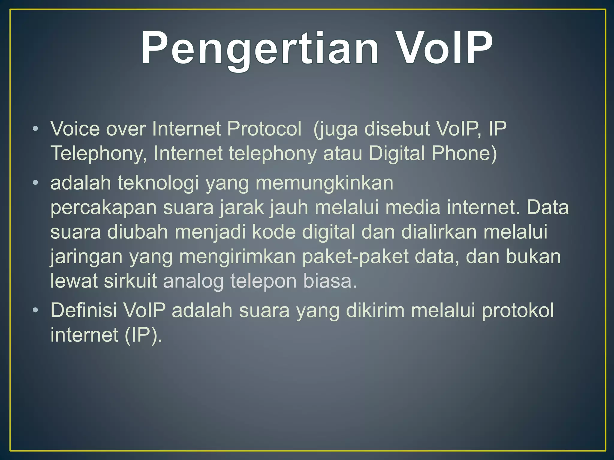 Kelompok 4 terdiri dari 5 siswa kelas XI-A yang membahas tentang Voice over Internet Protocol (VoIP). VoIP merupakan teknologi yang memungkinkan percakapan suara jarak jauh melalui jaringan internet dengan biaya yang lebih rendah dibandingkan sambungan telepon konvensional. VoIP mengubah sinyal suara menjadi paket data digital yang dikirimkan melalui protokol internet.