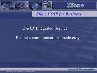 Z-REX is an integrated communications solution from Zfone VOIP for Business that provides VOIP, telephone systems, and business internet services. It offers advanced telephony features along with cost savings, enhanced capabilities, and multi-site support through a fully managed service. Z-REX provides companies with unparalleled features and benefits while lowering costs now and in the future.