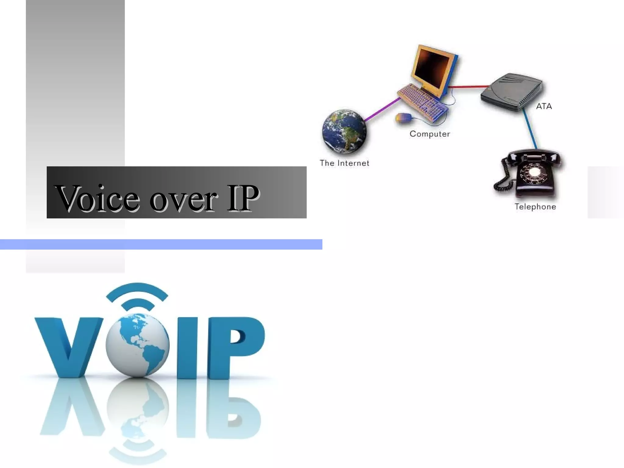 This document provides an overview of Voice over IP (VoIP) technology. It discusses how VoIP works by converting voice signals to digital packets and transmitting them over the Internet. The key components of a VoIP system include compression of the voice, encapsulation into IP packets, and routing through the network. Popular applications of VoIP include video chat programs and online gaming. The document also notes that many companies are interested in adopting VoIP to save costs and better utilize bandwidth. However, VoIP faces some security risks since it transmits voice over the public Internet.