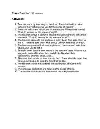 Class Duration: 55minutes Activities: 1. Teacher starts by knocking on the door. She asks the kids: what sense is this? What do we use for the sense of hearing? 2. Then she asks them to look out of the window. What sense is this? What do we use for the sense of sight? 3. The teacher sprays a perfume around the classroom and asks them to smell it. What do we use for the sense of smell? 4. The teacher passes to the students a teddy bear. She asks them to feel it. Then she asks them what do we use for the sense of touch. 5. The teacher gives each student a piece of chocolate and asks them what do we use to eat it. 6. She tells them that the new sense is the sense of taste. We use our tongue to taste all kinds of food and drinks like chocolate, sandwiches, chicken, chips, juice… 7. She asks the kids about their favorite food. Then, she tells them that we use our tongue to taste the food that we like. 8. The teacher shows the students the power point about the five senses. 9. They discuss each slide and focus on the sense of taste. 10. The teacher concludes the lesson with the voki presentation.