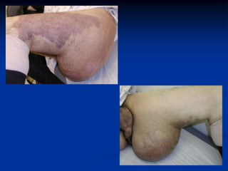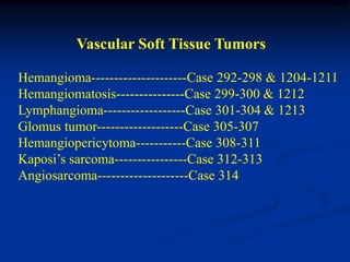 This document describes various types of benign soft tissue tumors, including several variants of lipomas. Superficial lipomas are the most common soft tissue tumor seen in orthopedic oncology, typically occurring in older patients on the back, shoulders, and neck. Intramuscular lipomas occur deeper in larger muscle groups between ages 30-60. Spindle cell lipomas are seen more in men ages 45-65 in the neck or shoulder. Angiolipomas occur in younger adults and are often painful due to increased vascularity. Ossifying lipomas are rare, with bone and cartilage present within the lipoma tissue. Imaging and histologic features of each variant are provided.