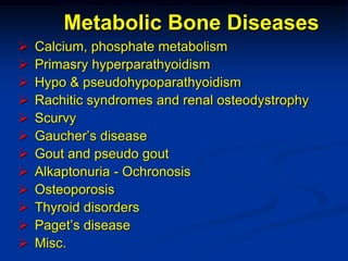 This document discusses various metabolic bone diseases including: