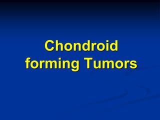 The document discusses several benign chondroid tumors including enchondroma, multiple enchondromatosis (Ollier's disease), Maffucci's syndrome, and periosteal chondroma. Enchondromas are common benign bone tumors that frequently occur in the hands and feet. Multiple enchondromatosis is a rare condition where multiple enchondromas form, often on one side of the body. Maffucci's syndrome involves multiple enchondromas along with soft tissue hemangiomas. Periosteal chondromas are similar to enchondromas but form on the surface of bones rather than internally.