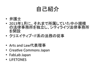 2013年1月に、それまで所属していた中小規模 の法律事務所を独立し、シティライツ法律事務所 を開設 • クリエイティブ・IT系の法務の従事 • Arts and Law代表理事 • CreaOve Commons Japan • FabLab Japan • LiFETONES