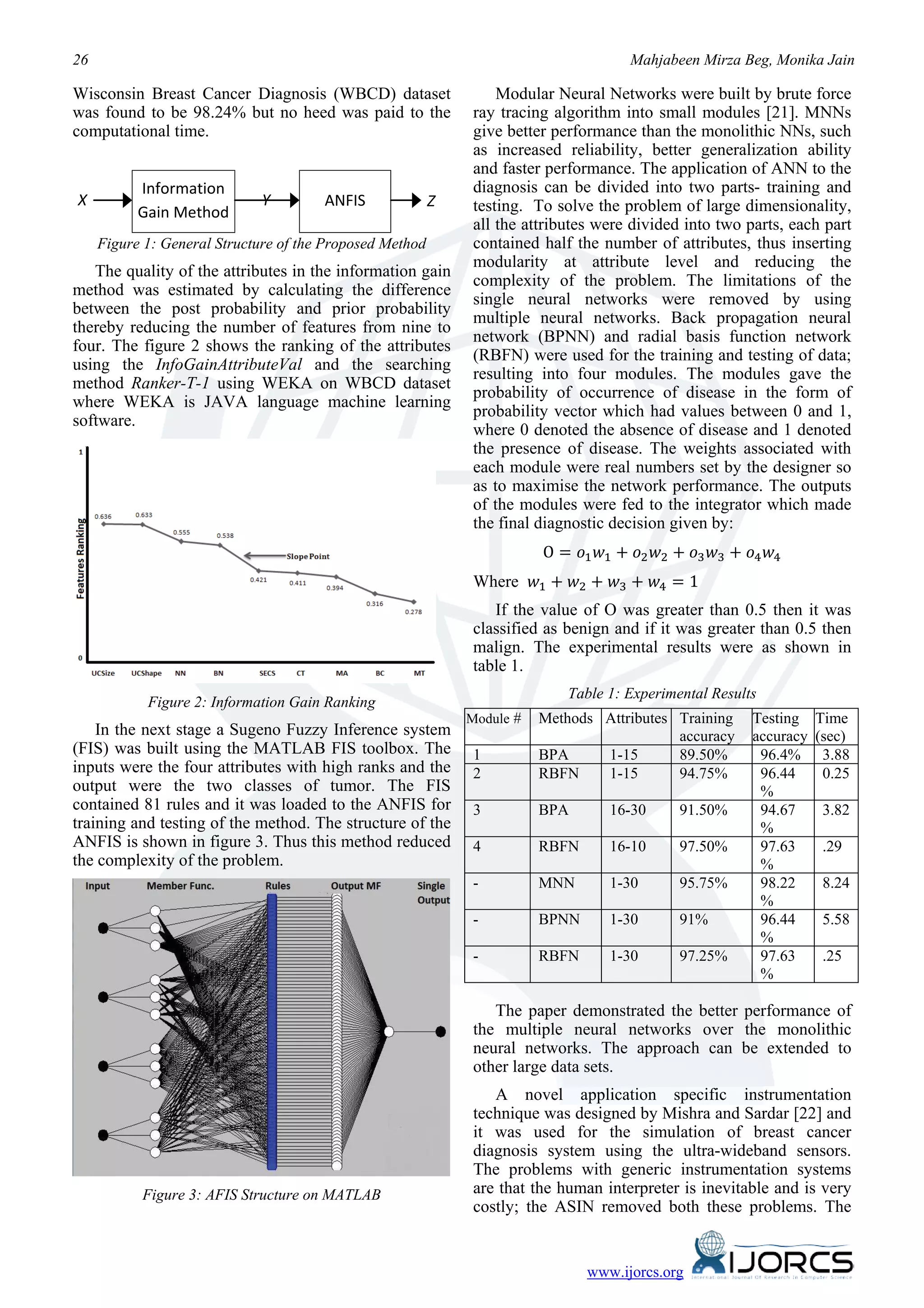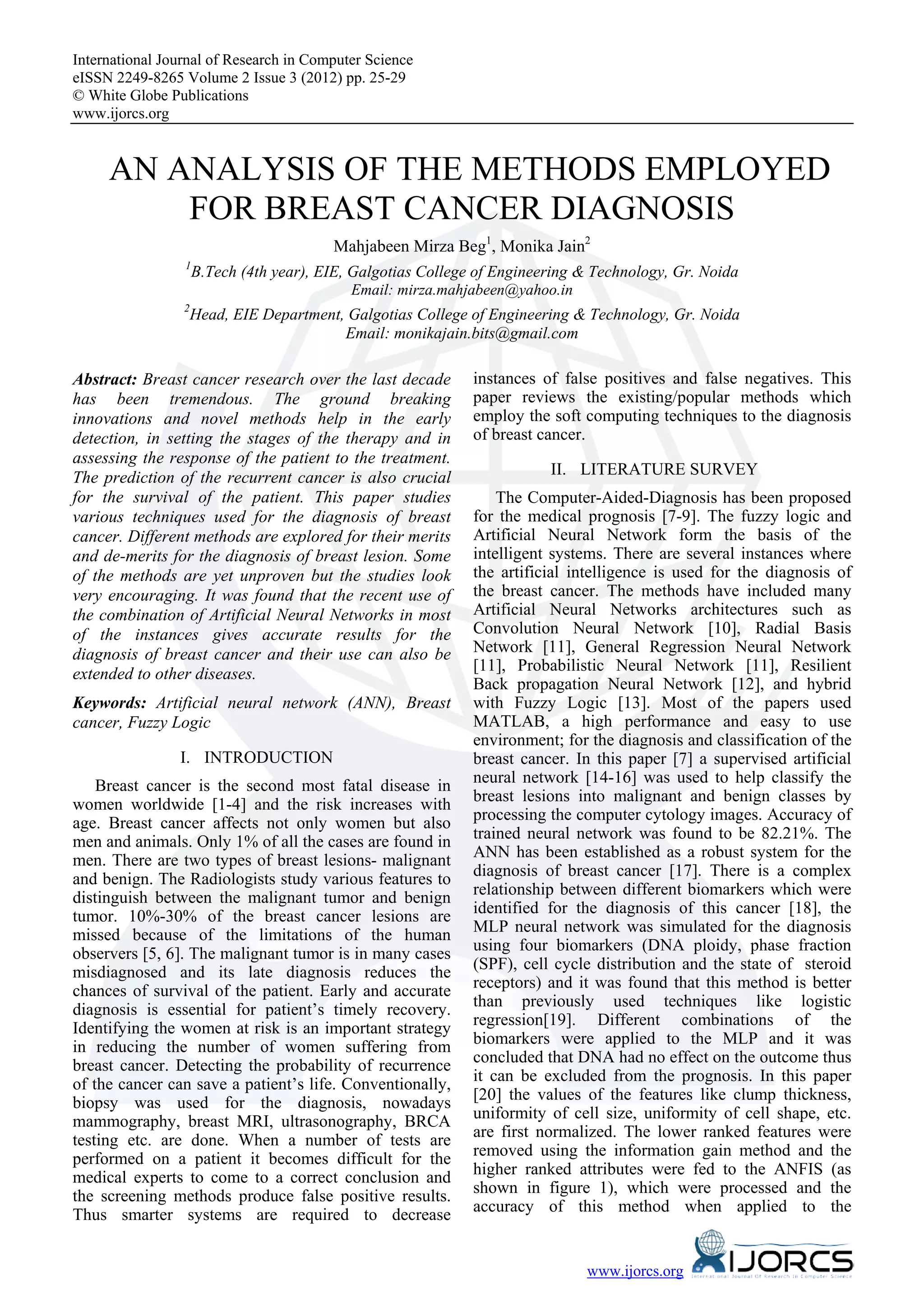 This document analyzes various methods used for breast cancer diagnosis. It discusses that artificial neural networks (ANNs) have been widely applied and are shown to increase diagnostic accuracy compared to individual methods. Multiple neural networks together provide better results than single networks. Recent approaches combine ANNs with other techniques like fuzzy logic. Overall, ANNs have become a robust and accurate system for breast cancer diagnosis and extending their use could help other diseases.