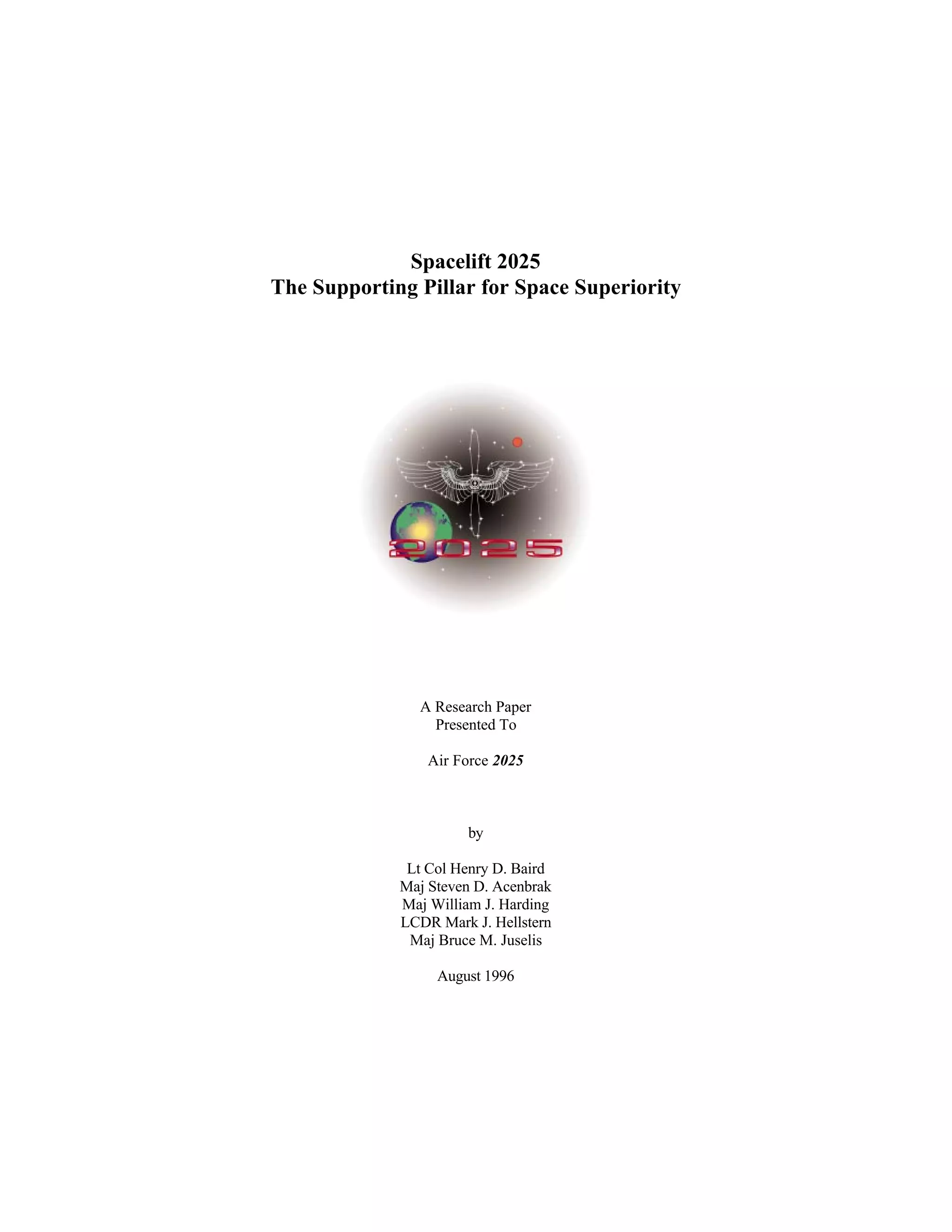 This document presents a research paper on the Spacelift 2025 system, which aims to establish routine space operations. It was presented to Air Force 2025 by five military officers. The paper defines key capabilities required for the 2025 system, including reusability, high-efficiency propulsion, modular payloads, low vehicle mass, streamlined infrastructure, simplicity, and affordability. It describes a national spacelift system comprising reusable multipurpose transatmospheric vehicles (MTVs) and orbital transfer vehicles (OTVs). The MTVs would provide reliable and cost-effective transport of payloads into low Earth orbit through routine and reusable operations. OTVs would transport payloads between orbits. The paper recommends pursuing