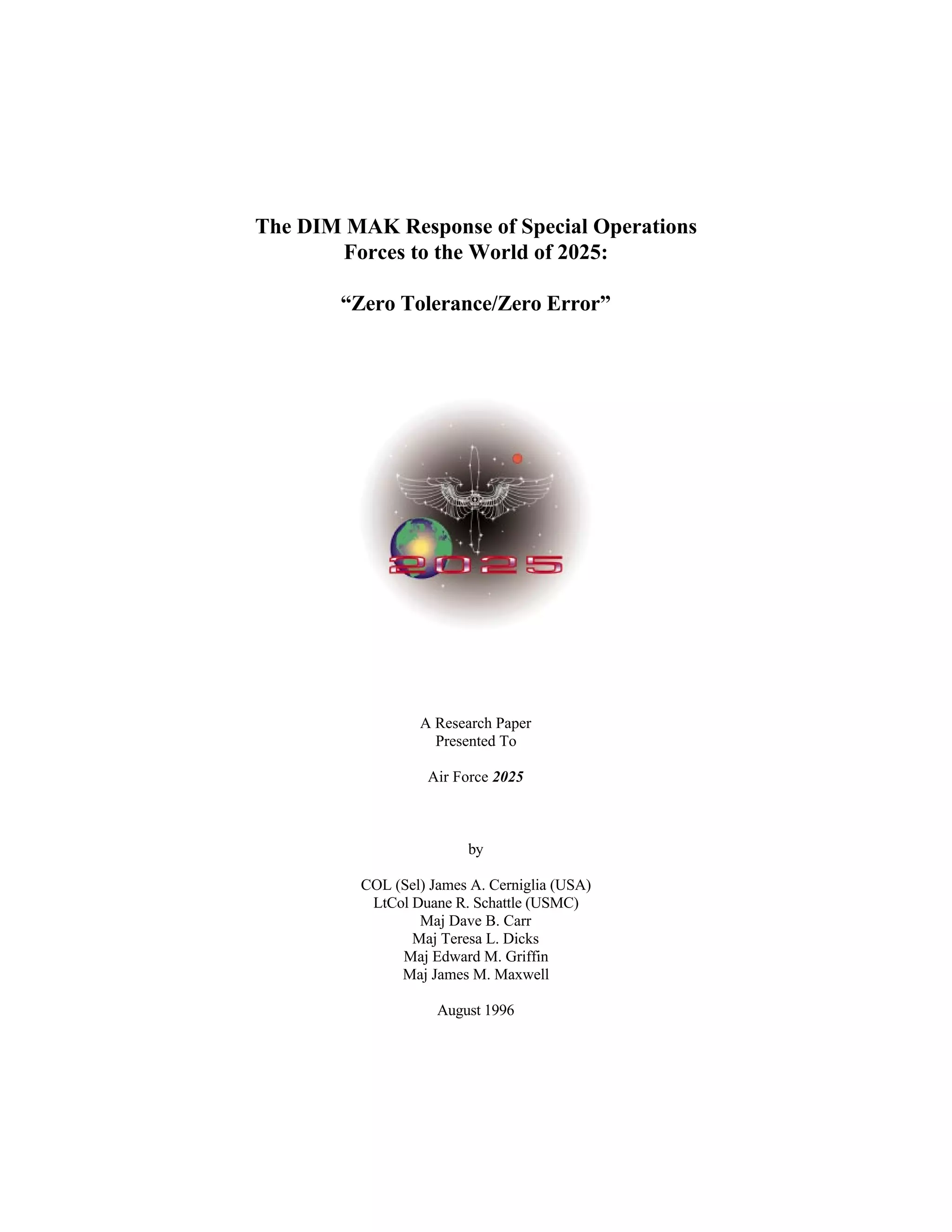 This document summarizes a research paper presented to Air Force 2025 that outlines special operations forces capabilities needed to conduct precision operations against weapons of mass destruction, high-value targets, and assets in the hypothetical world of 2025. The paper identifies communications, mobility, and destruction/neutralization as the top three enabling capabilities required for these missions. It then proposes various futuristic technologies that could fulfill requirements for these capabilities by 2025, such as stealth airlifters, extraction rockets, and targeting systems, to allow special operations forces to accomplish their missions with zero tolerance for error.