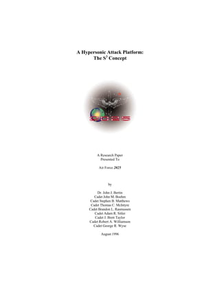 This document proposes an integrated hypersonic weapons platform called the S3 concept to fulfill three broad missions for US air and space forces in 2025: deliver decisive early blows, provide cost-effective in-theater dominance, and maintain access to space. The S3 concept involves three vehicles: the SHAAFT hypersonic attack aircraft, the SHMAC standoff hypersonic missile, and the SCREMAR reusable spaceplane. The SHAAFT would use a zero-stage flying wing to stage to Mach 3.5 and then cruise at Mach 12, able to launch the SHMAC missile or SCREMAR spaceplane. Together these vehicles aim to provide global reach, in-theater dominance, and access to space with