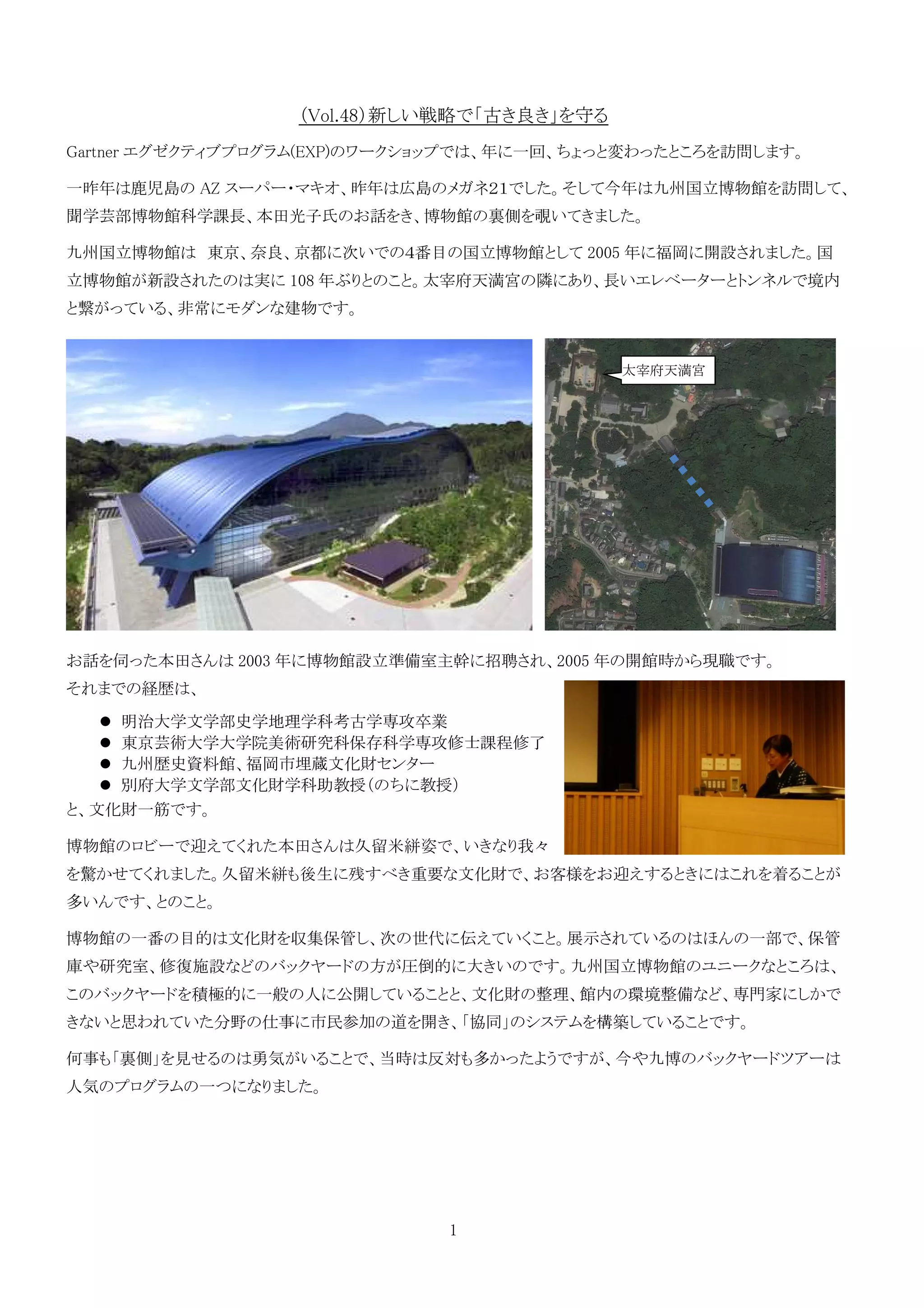 ボランティアの人たちの多彩な経験と技能を生かして、人間本来が持つ「自分の能力を発揮したい」「人の役 に立ちたい」「成長したい」というモチベーションをうまく引き出している。 4. 武勇伝がある 保管庫に開けた窓は、保守的な博物館文化への突破口。本田さんの考えを表す非常にシンボリックなものに なった。窓から見えるのはただの棚と箱。しかし、木目の方向や棚の構造などの話を聞いていると、「いいもの を後世に残す」ための日本人の情熱と知恵が伝わってくる。「目に見えるもの」を通じて「目に見えないものの 大切さ」を伝えたかったのではないか。 バックヤード見学後の懇親会には副館長の森田さんも参加いただき、文化財談義でさらに盛り上がりました。IT の活 用はまだまだできていないとの事でしたが、そこは CIO の集まりである EXP プログラム、いろいろと面白いアイディア が出て来ました。 (1) 展示品の説明 a. 電子ペーパーを使う(液晶ディスプレイは発熱の問題で断念した経緯あり) b. 超指向性スピーカーで、多言語で解説する c. スマートフォンやニンテンドーDS からアプリをダウンロードし、解説機として使う d. Augmented Reality を使って、展示品に説明をオーバーレイする (2) 収蔵品の研究、分析 a. 例えば曼荼羅を10センチ四方のブロックに分けてインターネット上に開示し、使われている模様の数を数 えてもらうなど、手間のかかる研究にクラウドソーシングを活用する。 (3) 寄付金の受付 a. Pay Pal などインターネット送金の仕組みを使い、100 円、1,000 円といった少額でも受け付ける。 b. 収蔵品の一覧をネットに掲載し、いいね!ボタンを押すと 10 円が寄付される仕組みを作る。 ※現在は1万円単位で、寄付申込書を請求するか PDF でダウンロードし、記入して FAX で送って銀行振 り込みという手順になっている。 まだまだいろいろなアイディアがありそうです。皆さんもぜひ考えて見てください。。 3