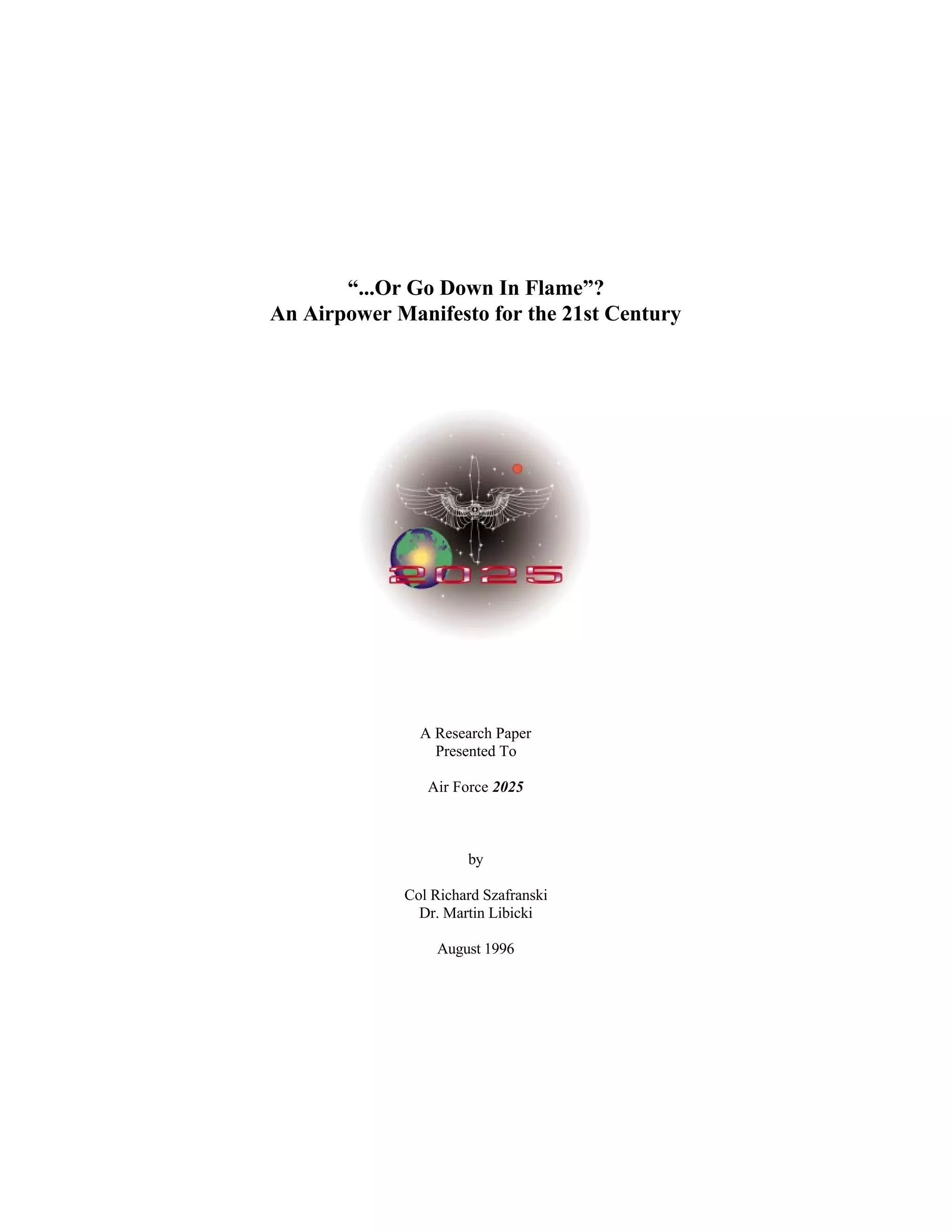 This document discusses a research paper presented to Air Force 2025 that argues the US Air Force should transition from being an atmospheric force to an infospheric force focused on controlling information and the battlespace. It proposes three new missions for the Air Force in the 21st century: extended information dominance to empower allies, global transparency to deter potential adversaries, and strategic defense. The paper advocates for the Air Force to develop a "metasystem" to integrate information and capabilities from all services and envisions the Air Force guiding the development and maintenance of this system.