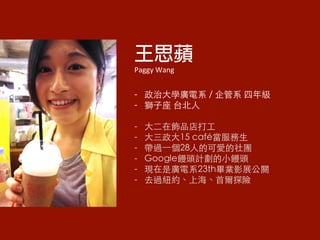 政治大學廣電系 / 企管系 四年級 - 獅子座 台北人 - 大二在飾品店打工 - 大三政大15 café當服務生 - 帶過⼀一個28人的可愛的社團 - Google饅頭計劃的小饅頭 - 現在是廣電系23th畢業影展公關 - 去過紐約、上海、首爾探險