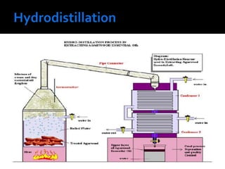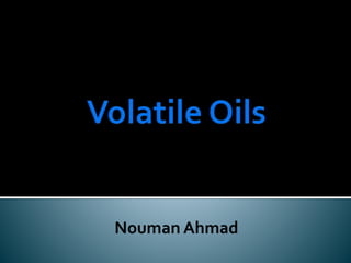 Volatile oils, also known as essential oils, are aromatic oily liquids found in many plants. They are highly volatile and evaporate easily at room temperature. Volatile oils are composed of hydrocarbons and oxidized hydrocarbons derived from terpenes. They are found stored in secretory cells, cavities, or channels located in different parts of plants. Volatile oils have various therapeutic uses and are also used in perfumes, cosmetics, and flavorings due to their strong aromas. They are extracted from plants using various techniques including water and steam distillation, solvent extraction, and enfleurage.