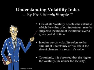 Different people view volatility differently, with some enjoying stock market volatility while others are harmed by it. The India VIX is a volatility index that measures implied volatility in the Indian stock market over the next month, indicating whether the market is in a complacent or anxious mood. It is calculated based on Nifty 50 index option prices, with higher readings associated with increased uncertainty and risk. The India VIX can be used to gauge market sentiment and as a basis for hedging instruments against volatility.