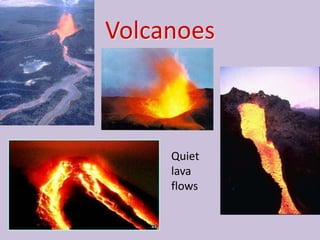 The document discusses volcanoes, including what they are, their internal structure, and the differences between magma and lava. It describes various types of volcanic eruptions like Hawaiian, Strombolian, and Vulcanian and the characteristics of each. Shield volcanoes, composite volcanoes, cinder cones, and dome volcanoes are also summarized in terms of their formation, eruptive styles, and resulting features.