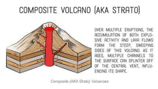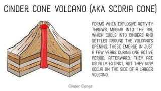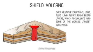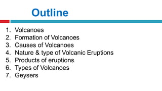 Volcanoes form when magma rises up from below the Earth's surface and erupts through openings called vents. There are several types of volcanoes defined by their shape and eruption characteristics. Shield volcanoes have gentle slopes and erupt runny basalt lava, while composite volcanoes are steep-sided and erupt thicker, stickier magma in more explosive eruptions. Cinder cones erupt small fragments and form small, cone-shaped volcanoes. Lava domes form when thick lava piles up in mounds. Volcanoes are caused by the movement of tectonic plates, which can allow magma to rise up in between the plates. Geysers, which are hot springs