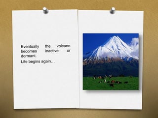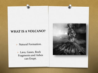 Magma from the Earth's core forces its way through cracks in the crust, forming volcanoes at the surface. When a volcano is about to erupt, there are loud noises, shaking ground, and magma building up under the surface. During an eruption, volcanoes expel poisonous gases and destroy everything in their path.