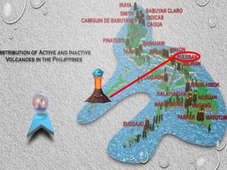 The document discusses volcanoes found in the Philippine archipelago. There are several volcanic belts distributed throughout the country that contain many active volcanoes. Some of the most active volcanoes with short repose periods mentioned are Mayon, Taal, Bulusan, Canlaon, Hibok-Hibok, and Pinatubo. Details are provided on the characteristics and eruptions of Taal, Mayon, Bulusan, Canlaon, and Pinatubo volcanoes.