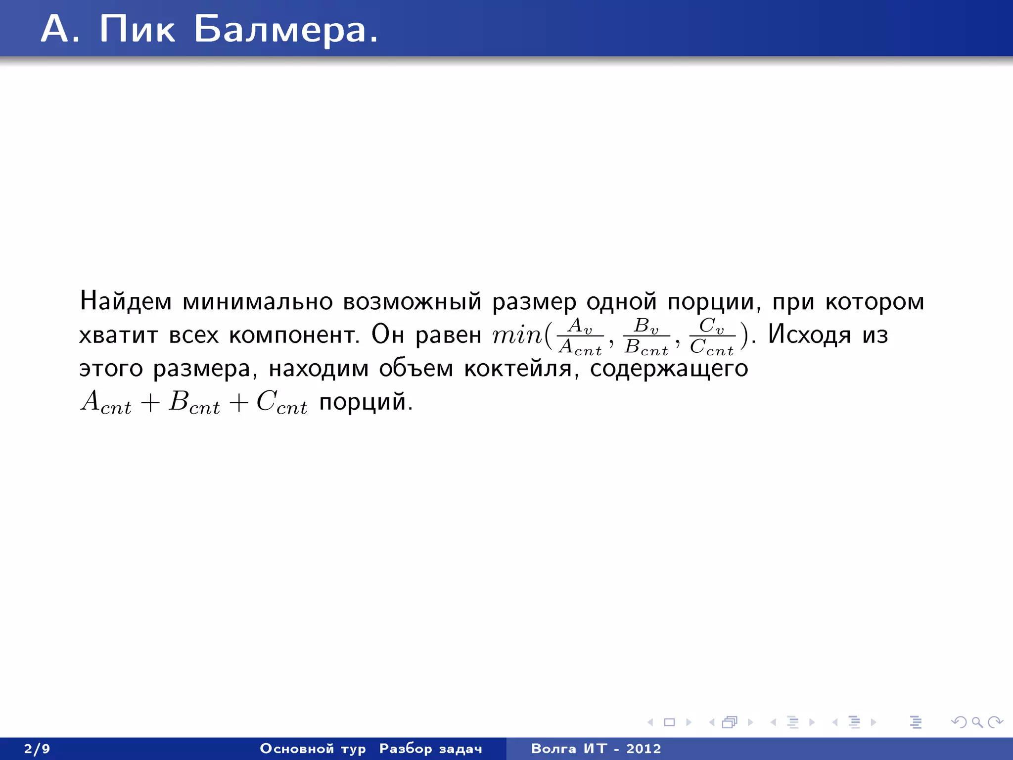 Íàéäåì ìèíèìàëüíî âîçìîæíûé ðàçìåð îäíîé ïîðöèè, ïðè êîòîðîì õâàòèò âñåõ êîìïîíåíò. Îí ðàâåí min( Acnt , Bcnt , Ccnt ). Èñõîäÿ èç Av Bv Cv ýòîãî ðàçìåðà, íàõîäèì îáúåì êîêòåéëÿ, ñîäåðæàùåãî Acnt + Bcnt + Ccnt ïîðöèé. 2/9 Îñíîâíîé òóð Ðàçáîð çàäà÷ Âîëãà ÈÒ - 2012