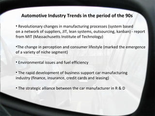 The document discusses Volkswagen's strategy to globalize and achieve excellence across all fronts from the 1990s to early 2000s. It overviews automotive industry trends, VW's shift to move upmarket and fill niches left by Audi, and its platform strategy of modular production. This allowed integrated global manufacturing, flexibility, and lower costs. Key aspects included world-class manufacturing through innovation and partnerships. Ferdinand Piech transformed VW through aggressive expansion, platform sharing, and a four-day work week to increase flexibility and reduce costs, helping VW succeed. Future challenges included maintaining competitive advantages and addressing environmental issues.