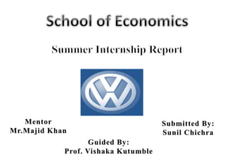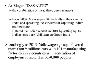 Volkswagen entered the Indian market in 2001 and has since delivered over 9 million vehicles across 101 factories in 27 countries, employing over 550,000 people. However, in Indore Volkswagen faces strong competition from Maruti Suzuki and Hyundai and needs to improve its services, offers, advertising, dealership network, and address customer complaints in order to improve its market share. Research found customers want lower prices, better financing options, and more information about Volkswagen vehicles. The company's general manager acknowledged brand awareness is low and needs improving through marketing to create a stronger brand identity.