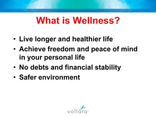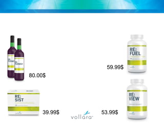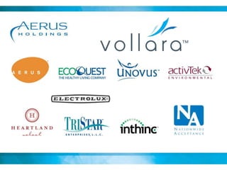 This document summarizes a company called Vollara that sells health and wellness products. It discusses the company's history, products like FreshAir and LivingWater that purify air and water, and leadership team. It also outlines the compensation plan for those involved in the direct selling business model and qualifications for career levels and rewards like a luxury car program.
