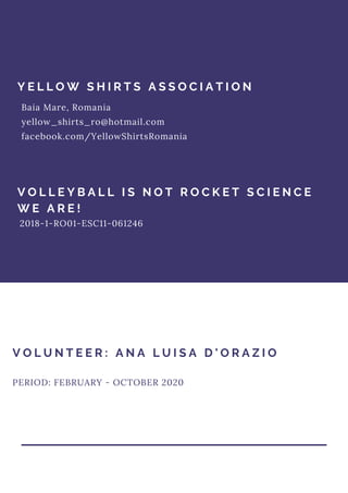 This brochure summarizes the volunteer experience of Ana Luisa D'Orazio with the Yellow Shirts Association in Romania from February to October 2020. As part of the project "Volleyball is not rocket science. We are!", she carried out a variety of activities including creating brochures, writing articles, conducting social media promotion, attending mentor meetings, doing sports photography, participating in cultural events, holding movie nights, and giving presentations. The experience allowed her to develop her skills in areas like design, photography, writing and community engagement while facing challenges from the COVID-19 pandemic.