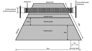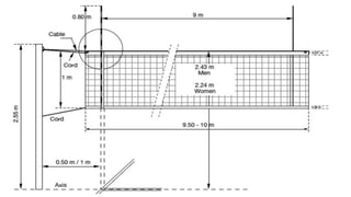 This document discusses volleyball, including its history, rules, skills, positions, and health benefits. It originated in the US in the 1890s and spread to other countries in the early 20th century. The objective is for teams of six players to land the ball in the opponent's court using skills like serving, passing, setting, and spiking. Proper technique and teamwork are required to score points and win sets in the regulated match format. Playing provides cardiovascular exercise and builds muscles, coordination, and social skills.