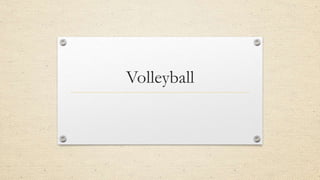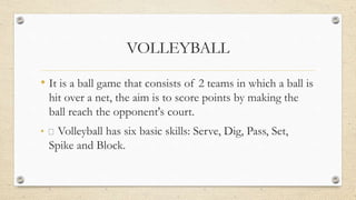Volleyball is a team sport involving two teams that score points by hitting a ball over a net into the opponent's court. Key aspects include the court dimensions, basic skills like serving, passing, setting, spiking, and blocking, and specific game rules. Teams consist of six players, and matches are played to a score of 25 points, requiring a win by two points.