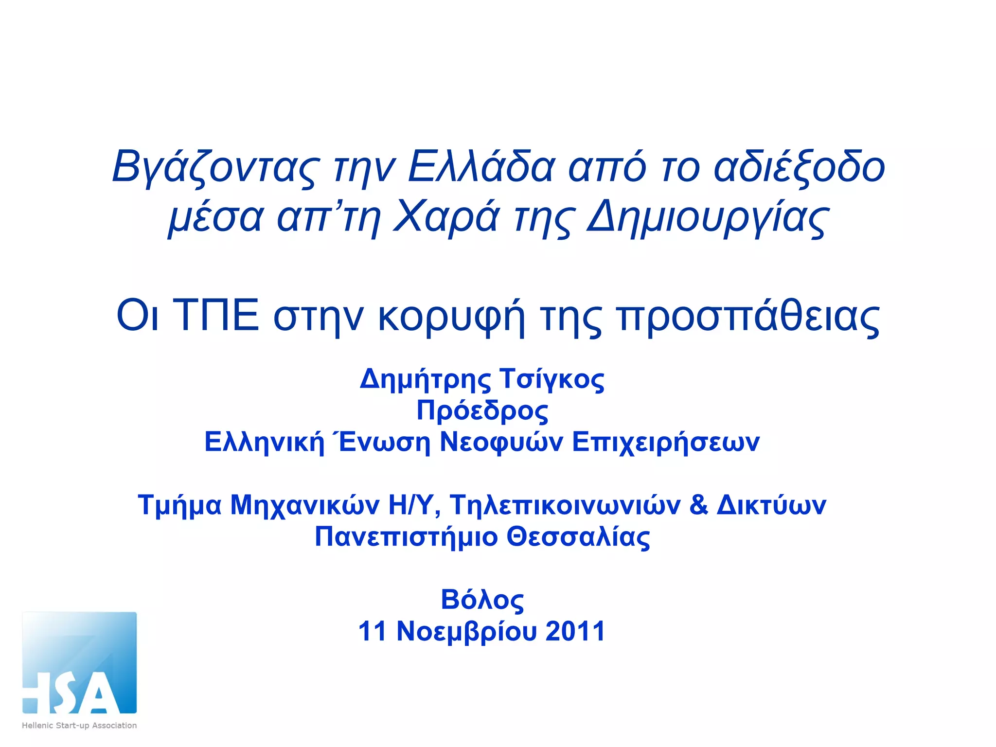 Βγάζοντας την Ελλάδααπό το αδιέξοδο μέσα απ’τη Χαρά της Δημιουργίας Οι ΤΠΕ στην κορυφή της προσπάθειας Δημήτρης Τσίγκος Πρόεδρος Ελληνική Ένωση Νεοφυών Επιχειρήσεων Τμήμα Μηχανικών Η/Υ, Τηλεπικοινωνιών & Δικτύων Πανεπιστήμιο Θεσσαλίας Βόλος 11 Νοεμβρίου 2011