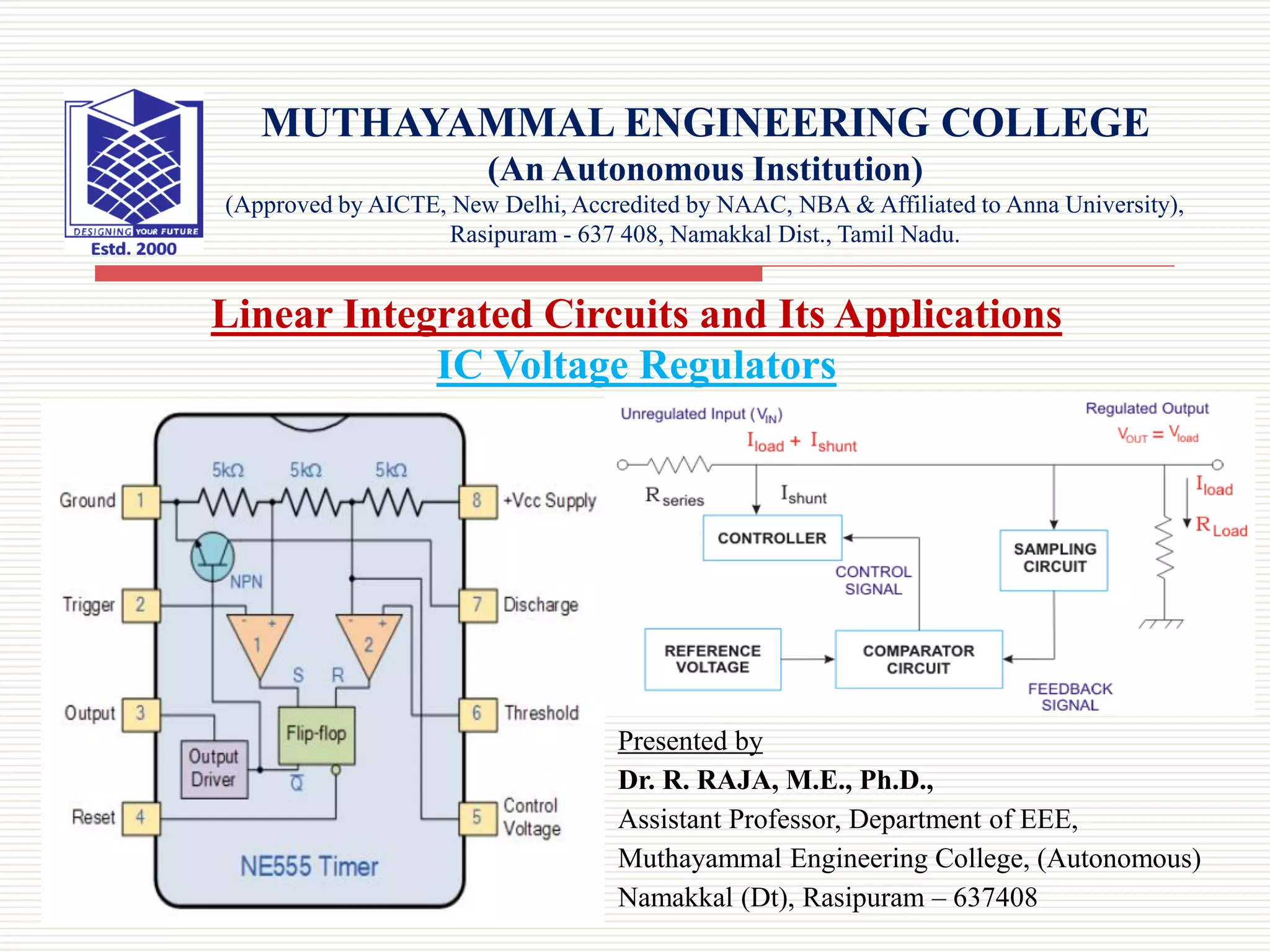 1) It defines an IC voltage regulator as an integrated circuit that regulates an unregulated input voltage to provide a constant, regulated output voltage.