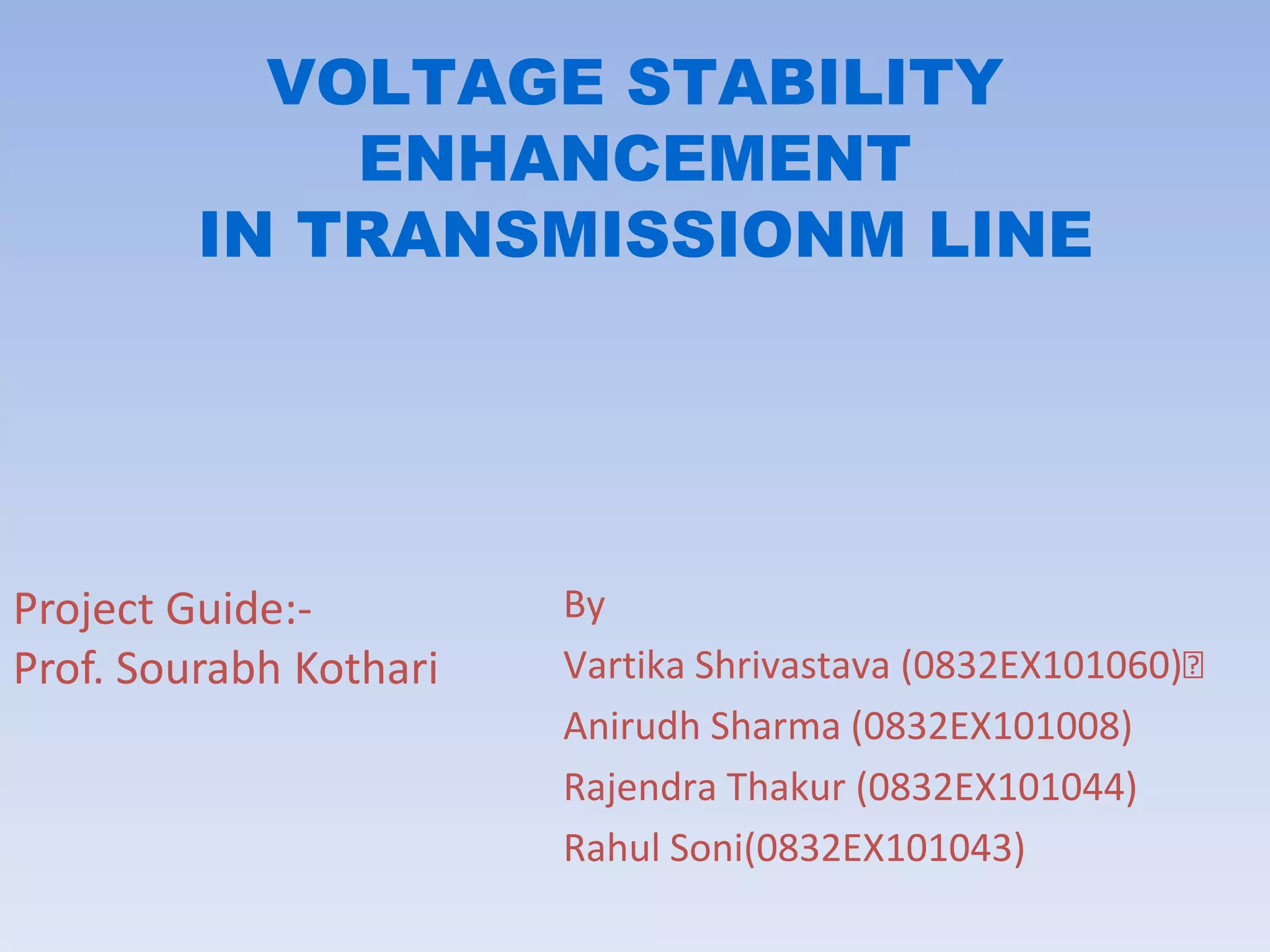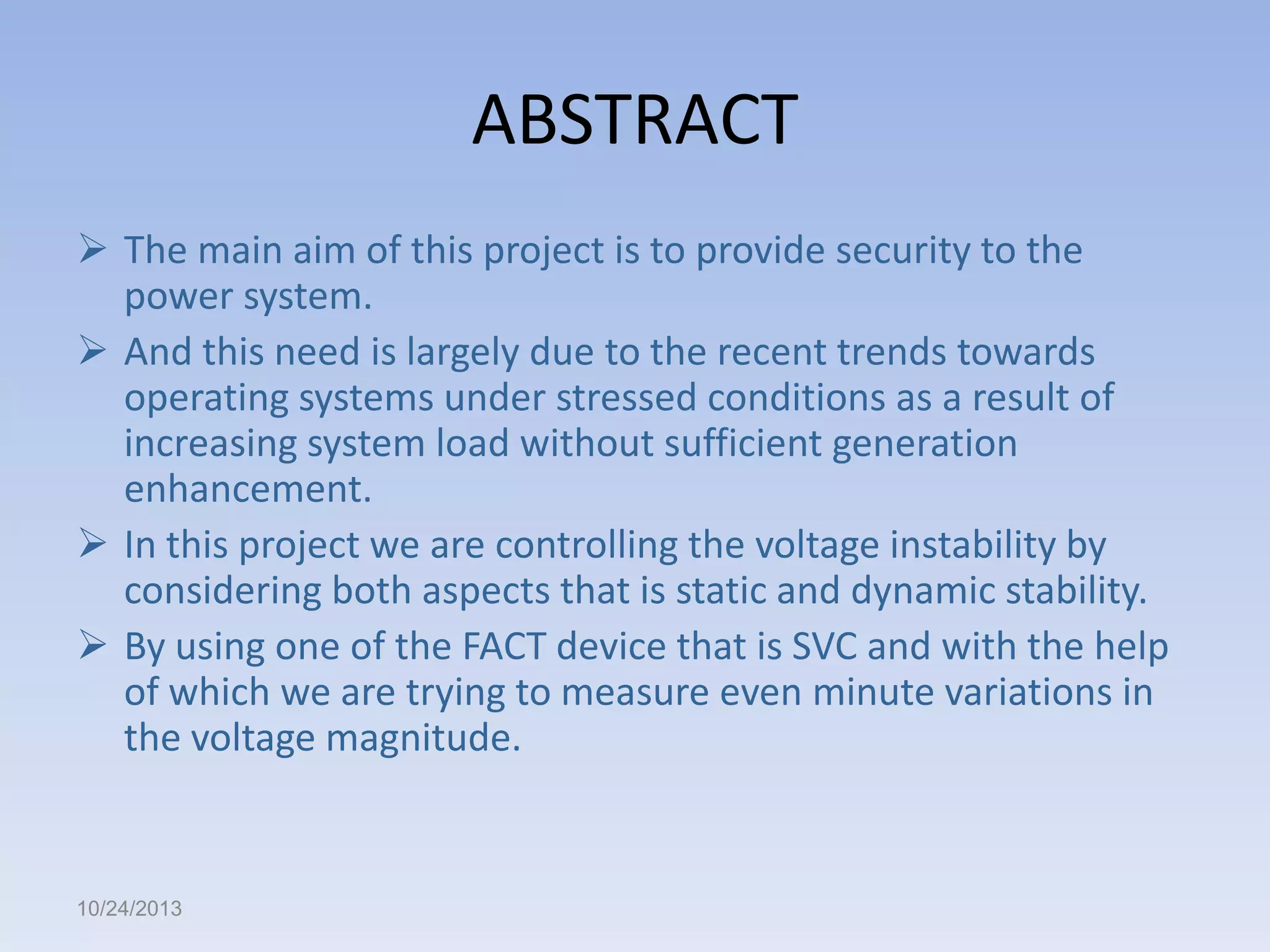 This document discusses enhancing voltage stability in transmission lines. The main goals are to provide security to the power system and control voltage instability considering both static and dynamic stability. This will be done using SVC, a FACTS device, to measure even minute voltage variations. The document outlines introducing SVC to control voltage, modeling the system in MATLAB, and studying previous research on maintaining power system stability using different devices.