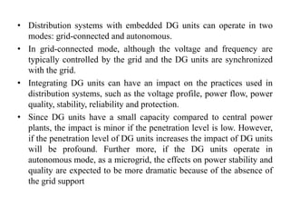 This document discusses distributed generation (DG) integration in distribution systems. It provides background on DG, including definitions and how DG can be operated in grid-connected or autonomous modes. The document reviews literature on DG planning and optimization techniques. It then states the problems of increased DG penetration, including potential voltage stability issues. The objectives of the proposed research are to enhance voltage stability with DG integration by optimizing DG location and size using sensitivity factors and a hybrid optimization algorithm. Formulas for calculating sensitivity factors are also presented. The document concludes by discussing simulation results and analysis.