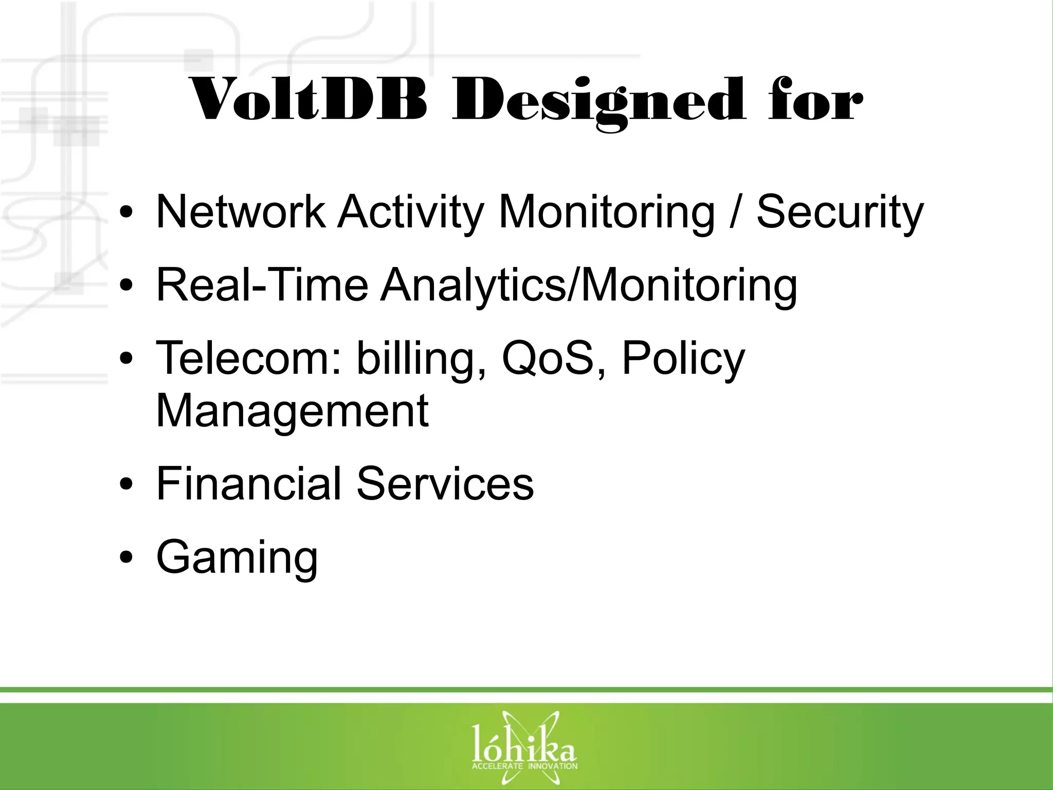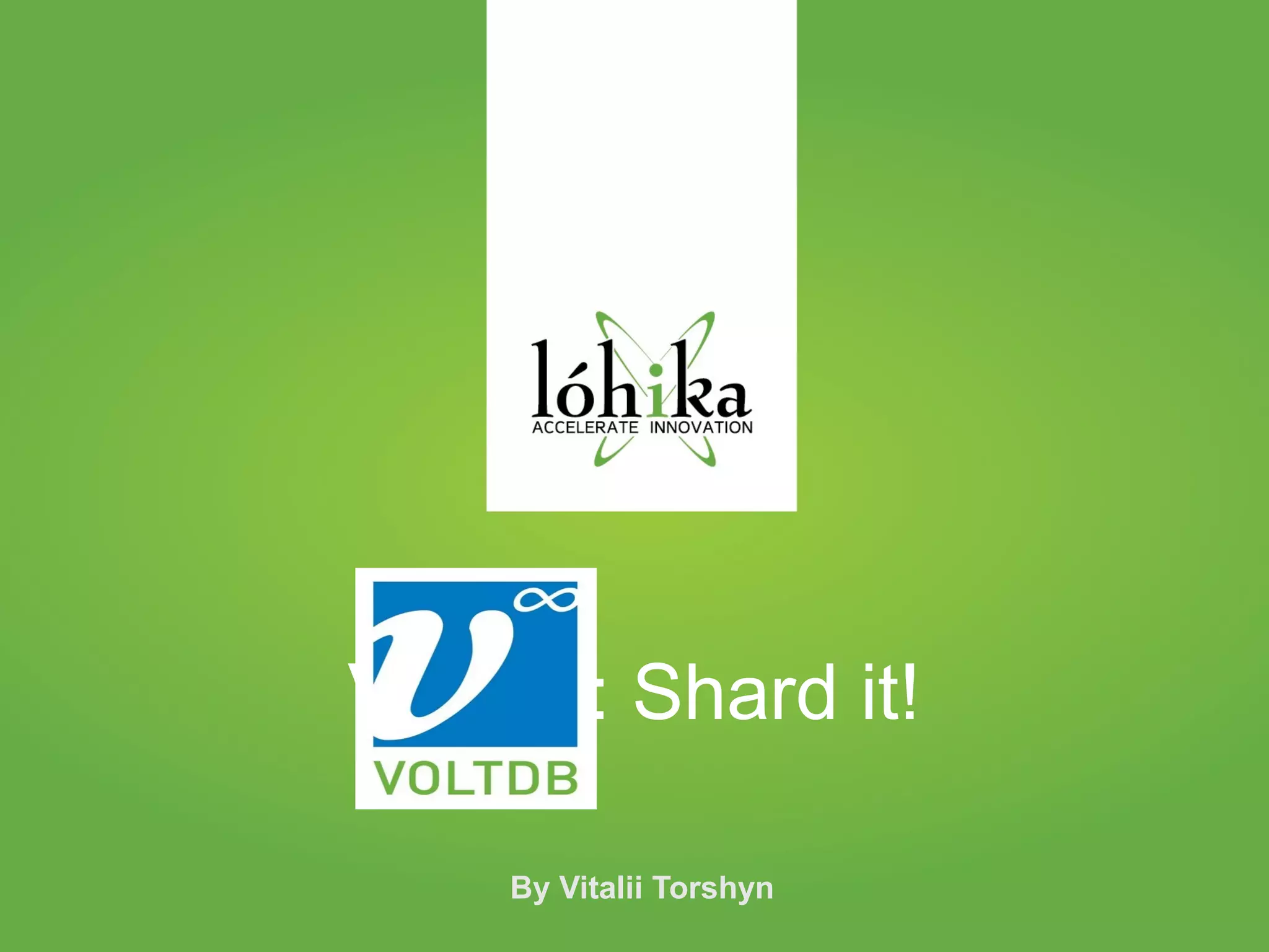 The document discusses VoltDB, an in-memory database designed for real-time applications. It covers VoltDB's features like horizontal partitioning, ACID compliance, and low latency. It then demonstrates a simple chat application built with VoltDB, including the database schema, Java stored procedures, and deployment. Finally, it provides tips for optimizing VoltDB applications and references for further information.