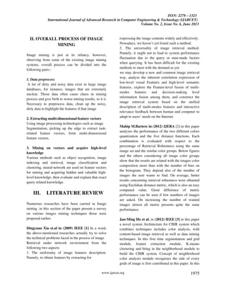 This document discusses content-based image mining techniques for image retrieval. It provides an overview of image mining, describing how image mining goes beyond content-based image retrieval by aiming to discover significant patterns in large image collections according to user queries. The document reviews several existing image mining techniques, including those using color histograms, texture analysis, clustering algorithms like k-means, and association rule mining. It discusses challenges in developing universal image retrieval methods and proposes combining low-level visual features with high-level semantic features. Overall, the document surveys the state of the art in content-based image mining and retrieval.