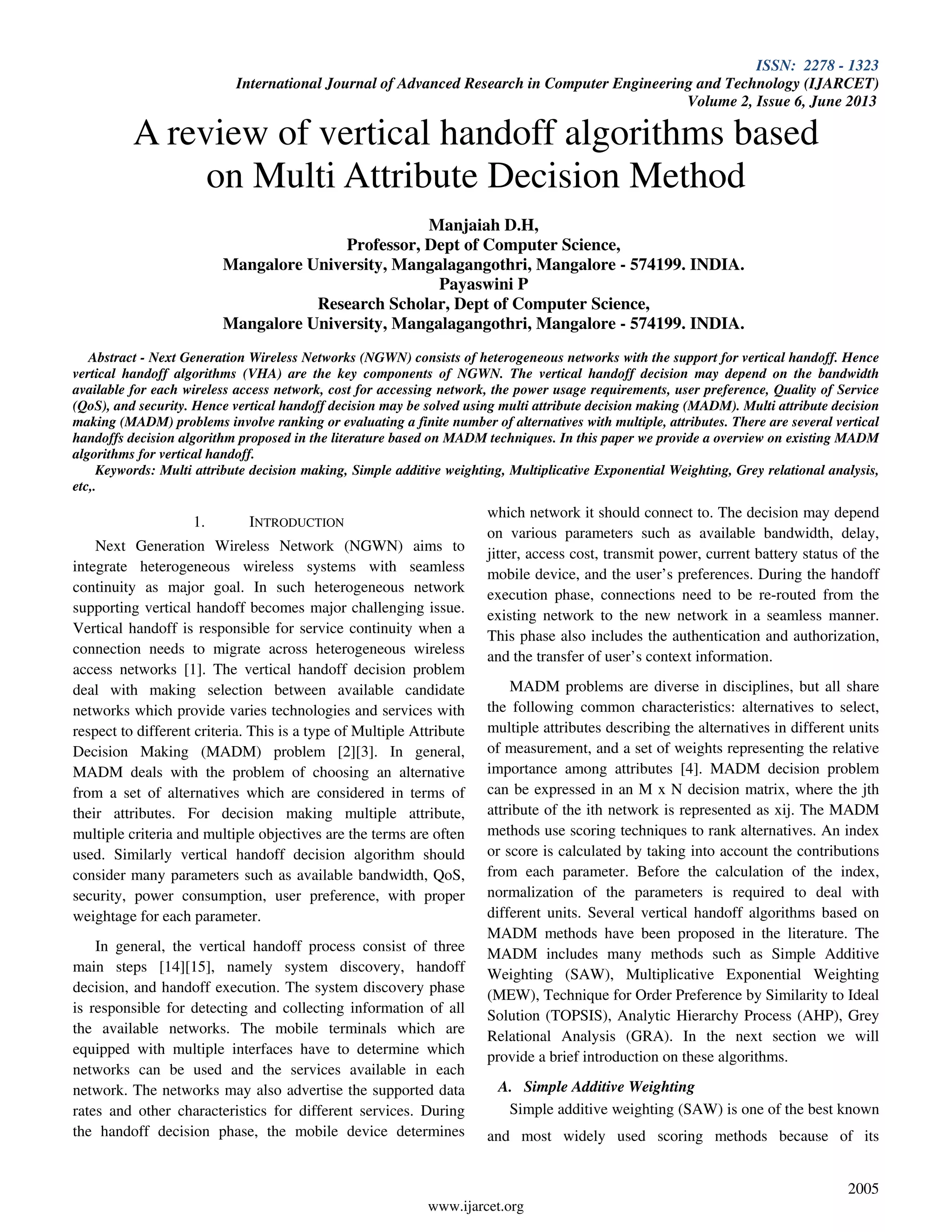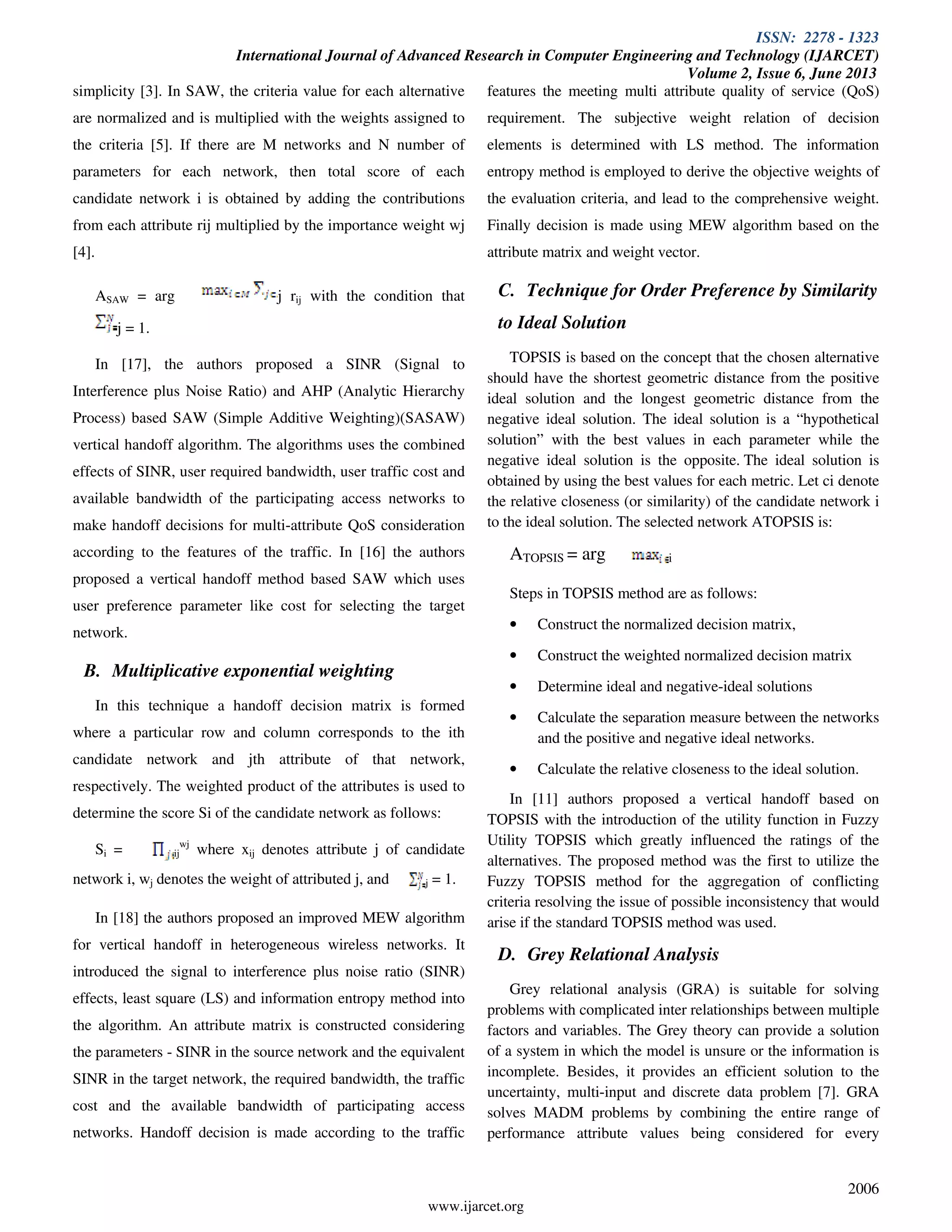 This document provides an overview of existing multi-attribute decision making (MADM) algorithms for vertical handoff decision making in heterogeneous wireless networks. It describes several popular MADM methods used as the basis for vertical handoff decision algorithms, including simple additive weighting, multiplicative exponential weighting, technique for order preference by similarity to ideal solution, grey relational analysis, and analytic hierarchy process. For each method, it provides an example of a vertical handoff decision algorithm from literature that uses that particular MADM approach. The document concludes that vertical handoff decision algorithms based on MADM methods can help provide seamless connectivity in next generation wireless networks.