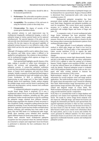 This document provides a review of multispectral palm image fusion techniques. It begins with an introduction to biometrics and palm print identification. Different palm print images capture different spectral information about the palm. The document then reviews several pixel-level fusion methods for combining multispectral palm images, finding that Curvelet transform performs best at preserving discriminative patterns. It also discusses hardware for capturing multispectral palm images and the process of region of interest extraction and localization. Common fusion methods like wavelet transform and Curvelet transform are also summarized.
