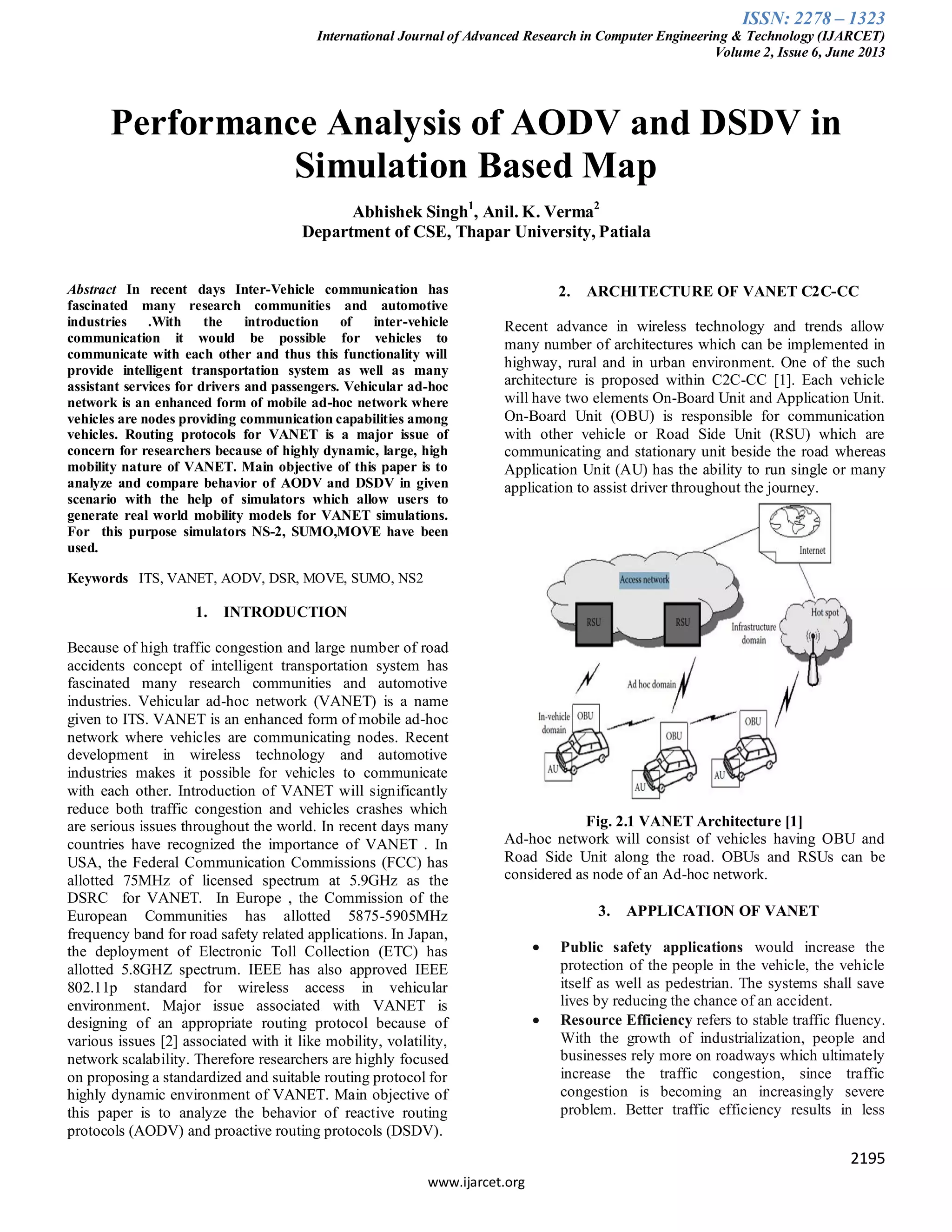 This document analyzes and compares the performance of the AODV and DSDV routing protocols in a vehicular ad hoc network (VANET) simulation. Simulations were conducted using NS-2, SUMO, and MOVE simulators for a grid map scenario with varying numbers of nodes. The results show that AODV performed better than DSDV in terms of throughput and packet delivery fraction, while DSDV had lower end-to-end delays. However, neither protocol was found to be fully suitable for the highly dynamic VANET environment. The document concludes that further work is needed to develop improved routing protocols optimized for VANETs.
