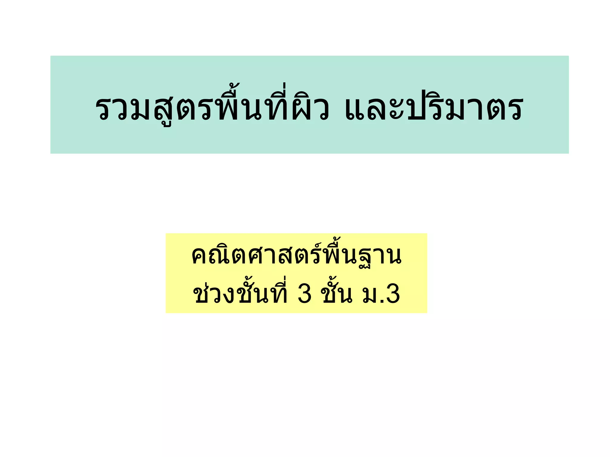 สูตร พื้นที่ของรูปสามเหลี่ยม =1 2 × ฐาน × สูง สูตร พื้นที่ของรูปสามเหลี่ยมด้านเท่า = 4 × ( ด้าน ) 2 _ สูตร พื้นที่ของรูปสามเหลี่ยม = เมื่อ s = a + b + c 2 a c b ให้บอก สูตรพื้นที่