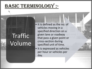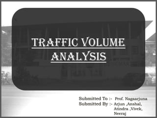 The document presents a traffic volume analysis conducted by students for a specific roadway, focusing on defining traffic volume, density, and passenger car units (PCU). It includes an objective to calculate total PCU values for mixed traffic data and details of vehicle classifications along with their respective PCU values. The study examines various factors affecting traffic capacity and provides data on vehicle counts across different road segments.