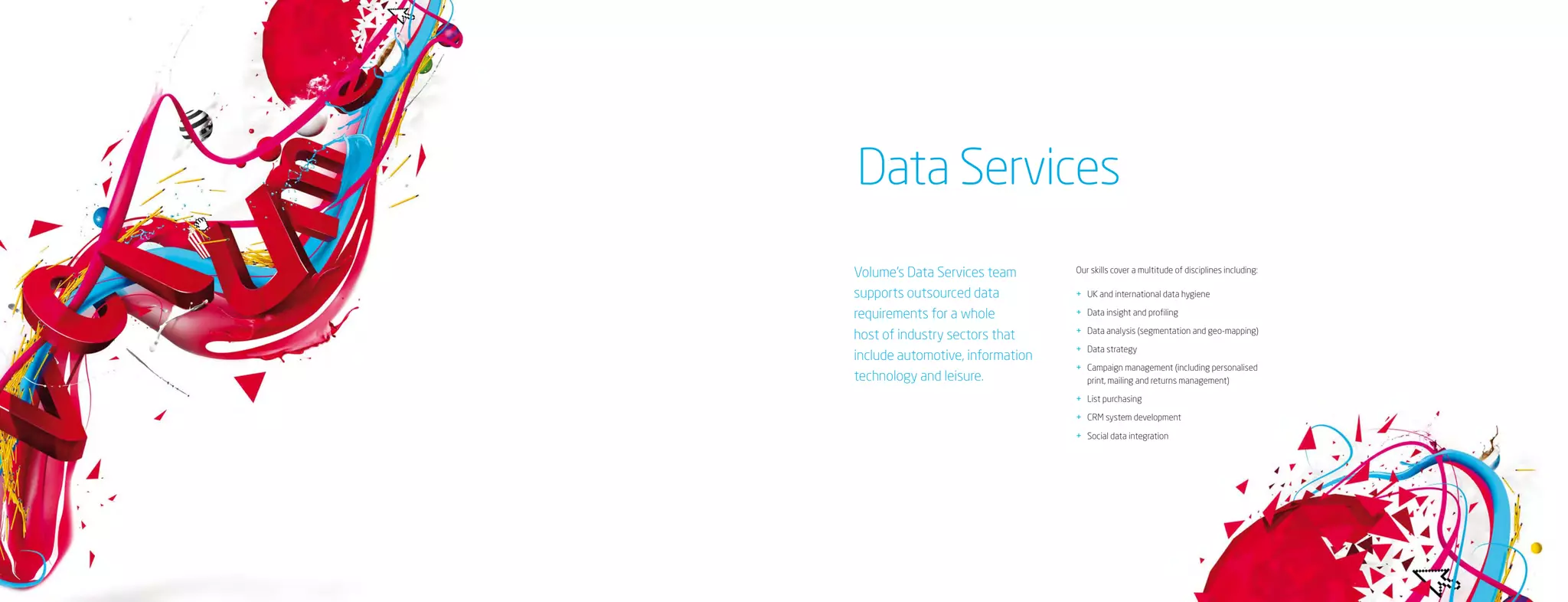 This document summarizes the data services provided by Volume, including data hygiene, analysis, strategy, campaign management, list purchasing, CRM system development, and social data integration. It provides examples of work done for clients in industries like automotive, IT, and leisure. Case studies describe cleaning and analyzing large customer databases, building CRM solutions, running targeted marketing campaigns, and more. The document promotes Volume's expertise in handling various data needs for clients.