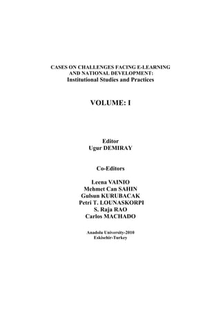 The document is an institutional study focused on challenges related to e-learning and national development, featuring contributions from various experts in distance education and communication. It highlights the backgrounds and research interests of the editors and contributors, who are affiliated with multiple universities and institutions across Turkey, Finland, India, and Belgium. The text discusses various aspects of distance education, including pedagogical support, instructional design, and the democratization of learning.