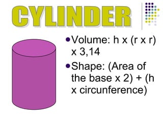 This document discusses the formulas for calculating the volumes and shapes of common 3D geometric objects. It provides the volume and shape formulas for cylinders, cones, spheres, prisms, and pyramids. Examples of these objects that can be found in real life are also listed. The document hopes that explaining these volume concepts has been both entertaining and educational for the reader.