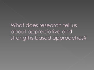 The document discusses Appreciative Inquiry (AI), an approach that focuses on what works well within organizations rather than focusing on problems. It sees organizations as systems that evolve towards positive images and outcomes when using positive language and questioning. Key aspects of AI include discovering an organization's strengths, envisioning positive potential, and inspiring change by focusing on life-giving forces. Research shows organizations using AI exhibit higher ratios of positive to negative dialogue and learning-focused questions, leading to greater employee engagement, performance, and organizational success.
