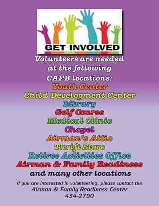Volunteers are needed at various locations on CAFB including the Youth Center, Child Development Center, Library, Golf Course, Medical Clinic, Chapel, Airman's Attic Thrift Store, Retiree Activities Office, Airman & Family Readiness, and many other locations. Those interested in volunteering should contact the Airman & Family Readiness Center at 434-2790.