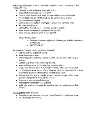 Volunteers are thanked for their important contributions to the successful operation of the spay/neuter clinic. While some roles like sitting with recovering animals may seem small, they are as vital as other tasks. The clinic relies on teamwork to safely help the community. Descriptions of various stations are provided, emphasizing the need for flexibility. Safety of animals and volunteers is top priority. Food donations are also needed to feed volunteers and staff.